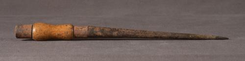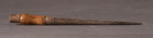 DescriptionMetal splicing fid with wooden handle sporting a metal cap and a spike of a circular cross-section. Also features rope residue on the tip.Material