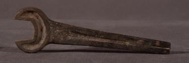DescriptionSingle headed spanner, probably handmade, with both the head and handle having a groove running through it.Material