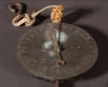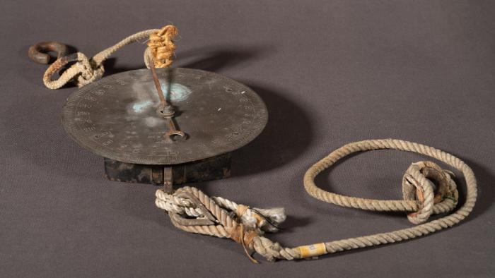 DescriptionBrass Spring Balance with a circular face, graded for 300 pounds weight, featuring rope attachments with three thimbles and another at the upper part with a hook for suspending the balance. The trademark, consists of two rope loops with a passing arrow and the word "Salter" surrounding it and an "S" inside the loop. Also features a rear casing in iron.InscriptionsInscribed "No. 85 Salter Spring Balance Made in England to weigh 300LB by 1LB".Material