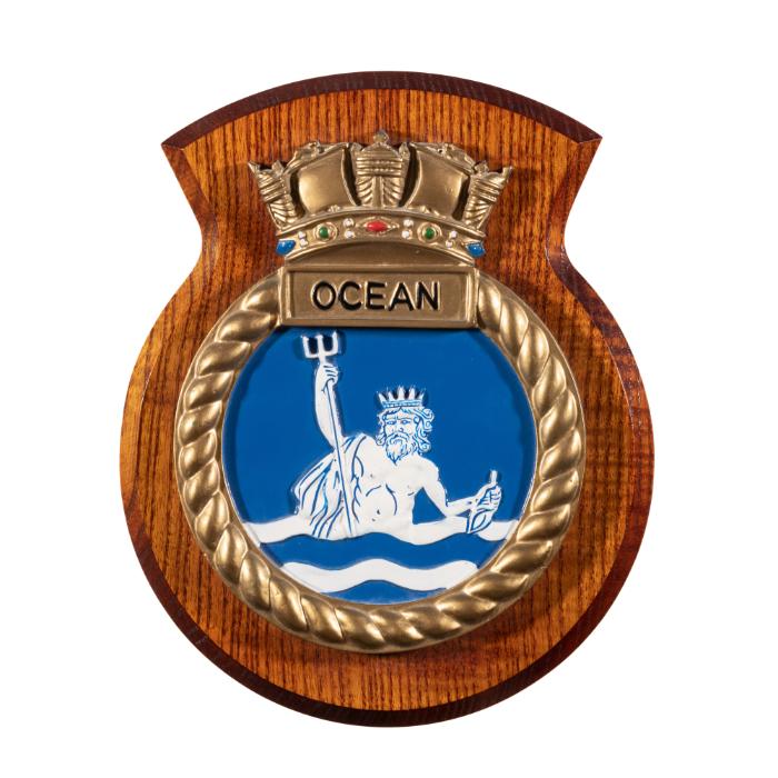 DescriptionShip badge of LPH helicopter carrier H.M.S. Ocean. She was designed to support amphibious landing operations and to support the staff of Commander UK Amphibious Force and Commander UK Landing Force.On a blue field, the god Poseidon in white, holding a trident in his right hand and a conch in his left on waves. The image is surrounded by a gold twisted rope below a naval crown.InscriptionsOn recto "OCEAN".Annotations and MarksOn verso, upper central part sticker reads "Hand painted by GK Beaulah & Co Ltd Heritage House 23 Park Street Hull HU2 8RU England Tel UK (0) 1482 223521 Fax UK (0) 1482 216328 Email gkb@beaulah.co.uk". Also written in blue ink on sticker "MM/1925". The latter is however incorrect, and it was thus struck off and the correct number "MM/1915" was writtten in pencil.Material