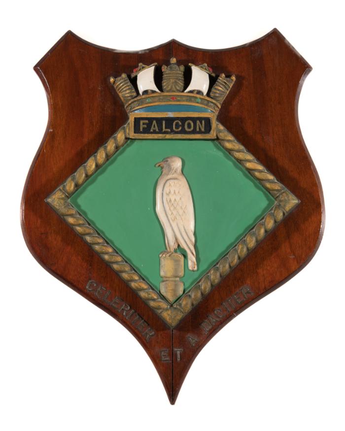 DescriptionThe badge is green, gyrfalcon silver on a perch gold. It is inscribed with a latin motto 'CELERITER ET A DACITER' meaning 'fast and audacious.' The badge is surrounded by a golden-coloured rope and is topped with a naval crown of the same colour. The badge is mounted onto a wooden Plaque as a commemorative piece.