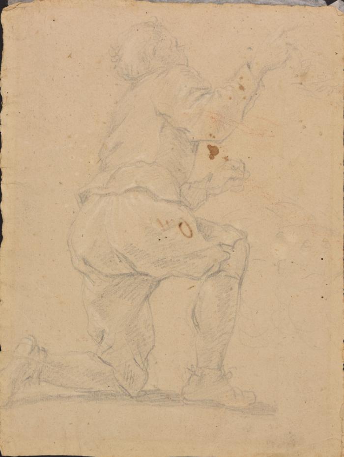 DescriptionThis is a preparatory figure drawing for a bigger composition. Depicting a young man on one knee in traditional florentine clothing as seen from the back lifting his right arm. Annotations and MarksOn verso, in brown ink, a oval and the word 'ovato' inscribed in the centre; on verso top right in pencil, '17' in a circle; on verso bottom centre right, in pencil, museum inventory number: '1669-70', 'FAS/D/29','D15.'Material