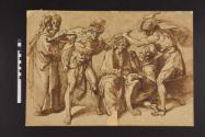 DescriptionThis drawing by the mannerist Bolognese artist Bartolomeo Passarotti depicts Christ being crowned with thorns and mocked. The composition is structured around six figures which fill up the drawing space, without any details suggesting the setting, making this scene reminiscent of a theatrical stage, specifically the Passion plays performed as part of religious processions during Holy Week. Christ is seated in the centre flanked by two figures, one on either side, affixing the crown of thorns on his head. To the right a kneeling figure mocks Christ, whilst to the far left two standing figures in oriental garments discuss the event. The composition is rendered quite energetically with quick pen strokes defining the bold gestural action of the figures, their bodies and faces bordering on the grottesque and denoting the influence of Northern mannerism.Annotations and MarksOn verso, top left corner, in pencil & circled: '4';