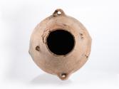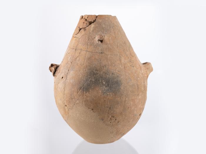 DescriptionJar with two sets of handles, the lower pair being larger than the ones in the upper tier. In addition, two small lugs appear around the middle tier of the jar. It bears incised geometric decoration.MaterialClay