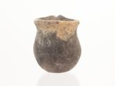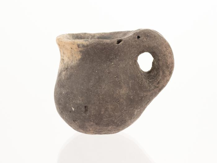 DescriptionClay miniature container with surviving rim and flat base. One complete handle.MaterialClay