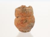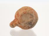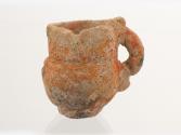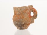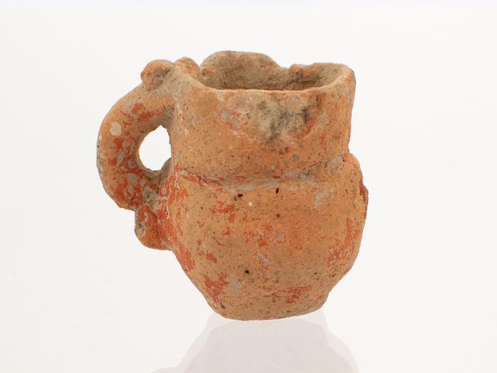 DescriptionMiniature clay container with surviving rim and footed base. Small clay discs are applied on the complete handle near the rim.MaterialClay