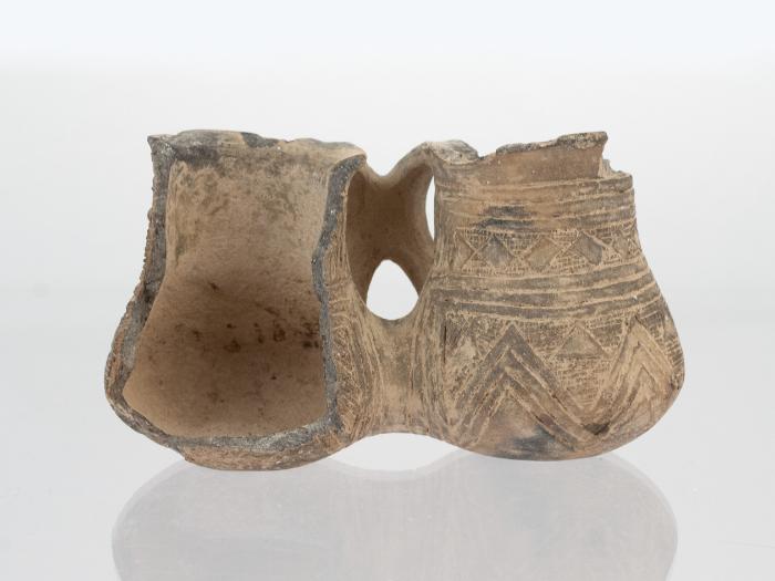 DescriptionTwo miniature jugs connected at the handles and at the lower part of the body, with rounded bases and everted rim. Decorated with incised geometric patterns. Each has a small lug in the lower part of the body. MaterialClay