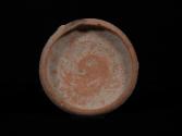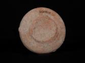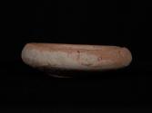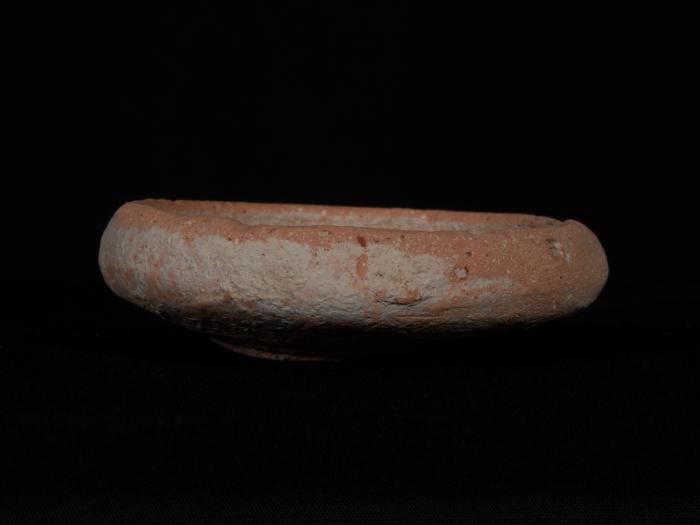 DescriptionSmall shallow bowl with inwardly inverted rim and a flat base. Covered with white slip. Blackened patch on the rim and one small side lug.Material