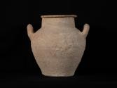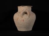 DescriptionFunerary urn containing cremated human remains. Two vertical loop handles. A dulled carination is formed where the shoulder meets the body. The rim is thin and flat-topped without further decorative features. Flat base and bulbous body. Covered in white slip.MaterialClay