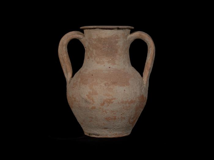 DescriptionAn urn with two handles and plain rim. The juncture of the neck and shoulder is more pronounced.MaterialClay