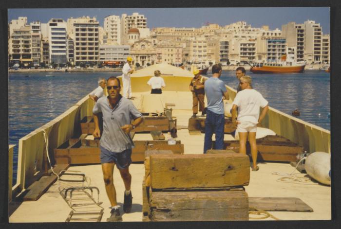 On the go. Yacht "Atlantide" at Manoel Island Yacht Yard (Malta) being prepared for lifting on mother ship for transport to Gosport UK