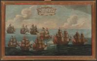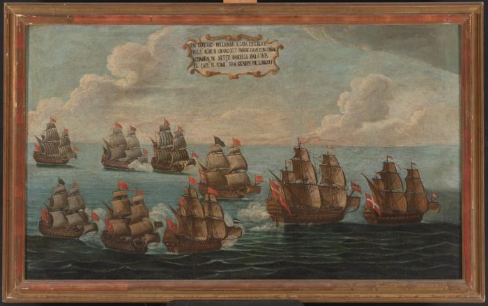 InscriptionsOn recto, in cartouche centre, top "In Contro Della Nave S. Cata.Na F.S. Croce Nelle Acue D Orano Li. 7. 7MBRE. 1708 Con Una Scuadra Di Sette Vascelli Dal Gier Il Capi.No Il Com.Or Fra Giosepe De Langou".Technique