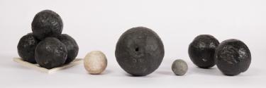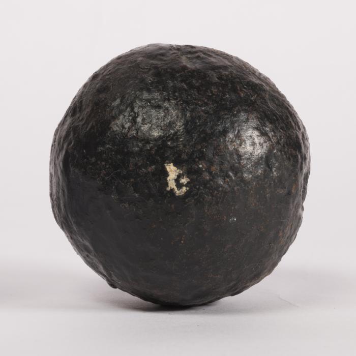 DescriptionA round cannonball of cast iron. Its dimension and weight roughly corresponds to that which would have been fired from a 4-pounder artillery piece. Such projectiles were often found aboard smaller merchant or corsairing ships and were meant to be used to cripple smaller craft. The relatively small size of the ball also made it more practical against personnel than heavier artillery pieces.MaterialIron