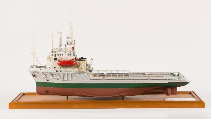 DescriptionThe 1405-ton Nan Hai 210 and sister-ship Nan Hai 211 were built by Malta Drydocks and Malta Shipbuilding in 1986, from Norwegian designs, for The National Oil Company of China. They are still in use today. InscriptionsOn plaque "Nan Hai 210 6000 bhp Anchor Handling Tug Supply Vessel LOA x B x Opt x D max 64.4m x 13.8m x 6.9m x 5.951m, Built for the National Oil Company of China by Malta Drydocks and Malta Shipbuilding. Model built by Malta Shipbuilding". TechniqueBuilt-up tops of wood and paint, mounted on baseboard.