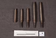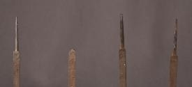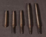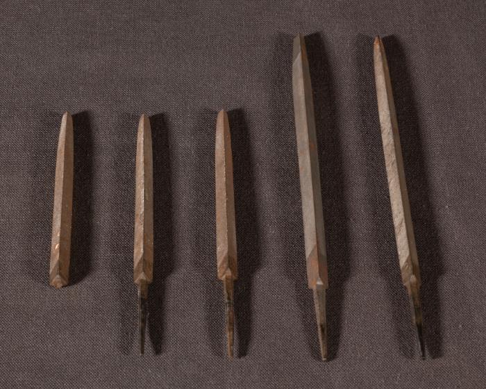 DescriptionFive three square files of various sizes. One file has a broken tang. All files are missing handles.Annotations and MarksOn recto and verso, three files are marked 'F.B.T England'. On recto, another file is marked 'Tomé Fèteira, Portugal' with trade mark.MaterialMetal