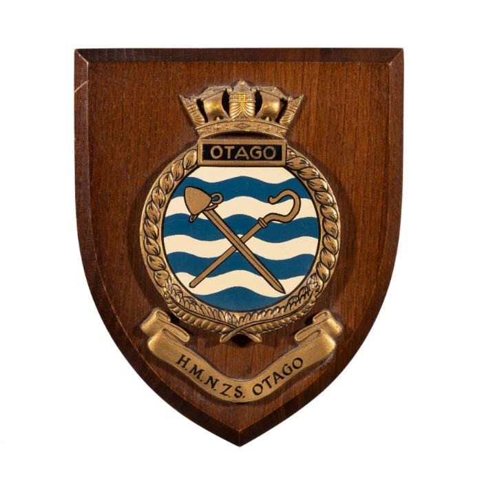 The circular badge encompasses the image of a sword and a staff which cross each other, on top of a barry wavy argent and azure field. The circular badge is surrounded by a twisting golden-coloured rope with two crossed golden-coloured ferns at the bottom and it is topped by a Naval Crown of the same colour. The badge is mounted onto a wooden shield plaque as a commemorative piece. Underneath the crest is a banner bearing the name of the ship 'H.M.N.Z.S. OTAGO.'