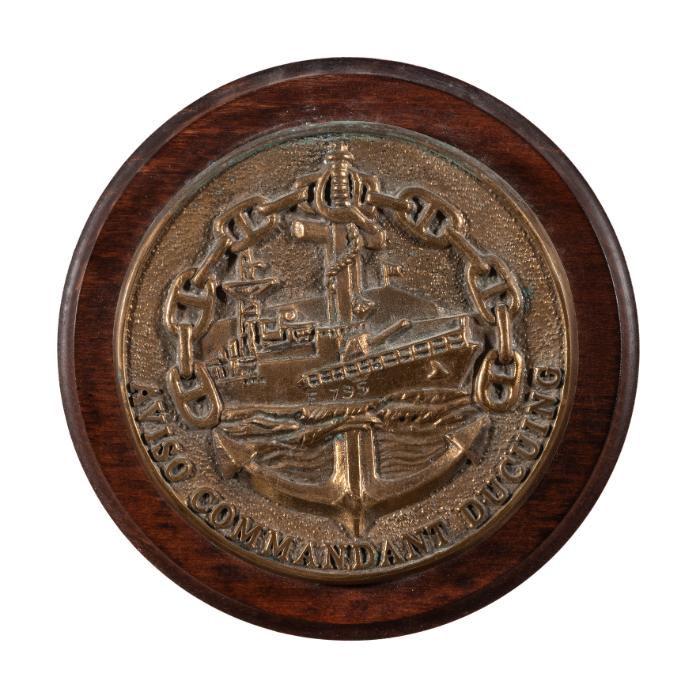 The badge depicts the ship during its career superimposing an anchor and a sword which runs down its vertical axis. A chain forms a circle around the image, connecting to the anchor. The item is not polychromised.InscriptionsOn recto "AVISO COMMANDANT DUCUING". On verso below in black ink "MM/559".Annotations and MarksOn Verso, carved inside the wood the word "FIA LYON".Material