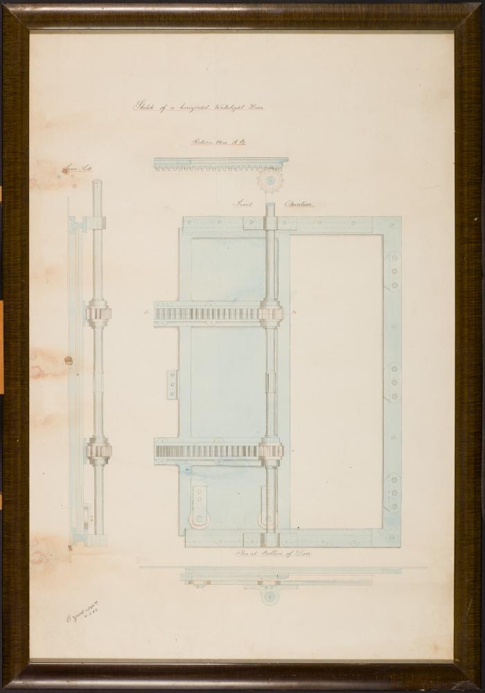 DescriptionSigned "E. Zarb appce 5-9-86".InscriptionsOn recto, top as title "Sketch of a horizontal watertight Door Section thro A 13". Technical words on the drawing such as "Front", "Elevation", and "Plan at Bottom of Door".TechniqueInk and wash, coloured by hand on paper.