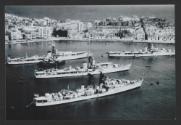 British Weapon-class destroyer HMS Broadsword (D31) in the foreground; Battle-class destroyers HMS Trafalgar (D77) and HMS Jutland (D62), the latter erroneously identified as HMS Chaplet (D52), in the background; and what is very probably Battle-class destroyer HMS Dunkirk (D09) in the middle, view to pennant number obstructed. All four destroyers served together in the Royal Navy's 7th Destroyer Squadron in the Home Fleet between its forming in 1957-8 and 1962, when Jutland was paid-off and put in reserve; at Sliema Creek, Marsamxett Harbour, Malta