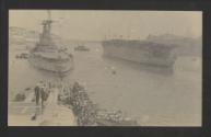 British aircraft carrier HMS Argus (I49), leaving Malta for China, as seen from a battleship and flanked by another battleship, at Grand Harbour, Malta
