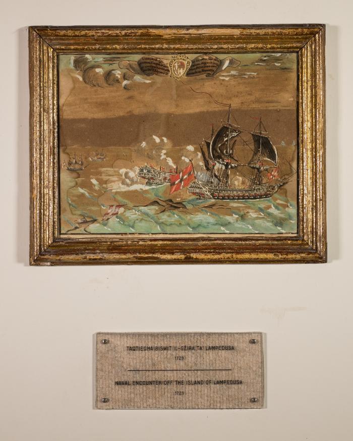 InscriptionsOn recto, top "Vassallo d' Algeria - to la - Gazzella/ preso nell'acque di Lampedosa dopo un lun:/ go combattimento colla nave S. Vincenzo com: to/ dal Cav. Fr. Scipione D. Eaulx li 24 Marzo 1729".TechniqueInk & gouache on paper; Water-gilded decorative frame