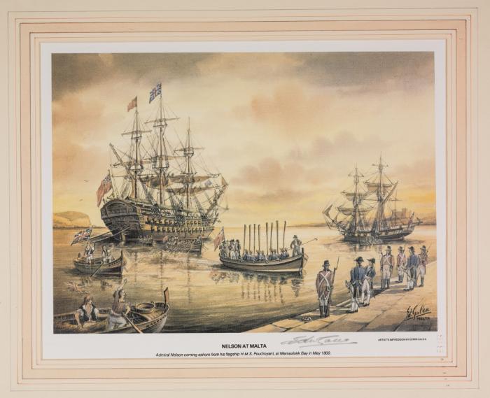 InscriptionsOn recto, under image "Nelson at Malta Admiral Nelson coming ashore from his flagship HMS Foudroyant, at Marsaxlokk Bay in May 1800". In smaller fonts "Artist's impression by Galea, Edwin".TechniqueOffset Lithograph from original watercolour by the artist himself.