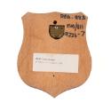DescriptionThe badge has the naval crown and surrounded by a rope edge. Behind it two crossed clear anchors. Field is divided per pale: on the left half, on Or field, a rampant black eagle; and on the right on blue field, three silver orbs. The badge was donated on the ship's visit to Malta 4-6 March 1996. This is the coat-of-arms of Tjerk Hiddes de Vries (1622-1666), Dutch admiral and naval hero.InscriptionsOn recto "Hr. Ms. Tjerk Hiddes". On verso, a note reads "HNLMS Tjerk Hiddes at Malta 4-6 March 1996". Also marked in black ink "Reg. 883 MM/811 9226-7".Annotations and MarksOn verso, top centre, gold sticker reads: "Heraldische wapenndustrie Hooymayers Mercuriusstraat 50 3133 En Vlaardingen Telefoon 010-4349133 Holland".MaterialWood, resin, paint