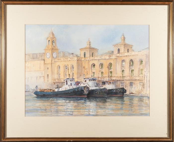DescriptionA watercolour painting by John Martin Borg painted in February 1992 depicting the Ex-Royal Naval Bakery (nowadays the Malta Maritime Museum) and 3 Tug Malta tug boats. The painting was commissioned by then curator, Antonio Espinosa Rodriguez.InscriptionsOn recto, mid-left, signed by the artist "John Martin Borg Feb '92".TechniqueWatercolour; commercially gilded decorative frame, with wooden backing
