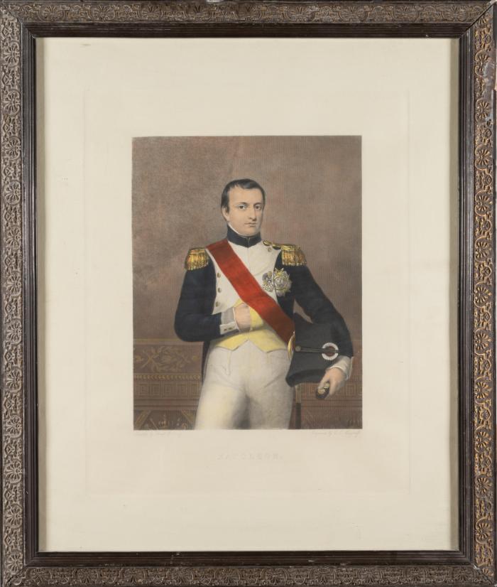 DescriptionThis coloured engraving was published in London in 1847. The half-length portrait depicts Napoleon Bonaparte in his military uniform decorated with medals of honour, and his right-hand resting inside his unbuttoned yellow-coloured vest beneath his jacket and red sash. In his left hand he holds his hat, slightly covering the hilt of the sword. His weight is shifted on his left leg. Napoleon is found within an interior setting decorated with wood moulding. The print is framed within a brown decorative frame, with an itricately carved, slightly gilded border. This print was produced by C.E. Wagstaff (1808-1850) after a portrait by Count D’Orsay (1801-1852). Wagstaff was a portrait and figure engraver. Two portrait engravings are found within the collection of the Royal Academy of Arts in London which are the Portrait of Professor Narrien, dated to 1843 and the Portrait of John Stock, J.P. (of Poplar), dated to c. 1814, both after Henry William Pickersgill RA (1782-1875). Alfred Grimond D’Orsay, better known as Count D’Orsay, a well-known dandy, was an amateur artist from France, and moved to London to work as a sculptor and painter especially in portraiture. Engravings of his portraits enjoyed great popularity.InscriptionsUnderneath engraving, in black ink handwriting, left-hand side "Painted by Count D'Orsay", right-hand side "Engraved by C.E. Wagstaff". Underneath, in block letters "NAPOLEON."Technique