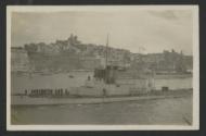 Surface warship in Grand Harbour, Malta, with Senglea, another surface vessel and a floating crane in the background
