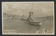Line of two British battleships in Grand Harbour, Malta; picture taken from another British battleship; captioned "The Flagships Line Grand Harbour"