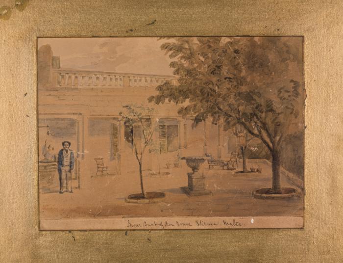 InscriptionsOn recto, handwritten in black ink underneath image "Inner Court of Our House Sliema, Malta". On verso, handwritten in black ink on brown paper "Admiralty House, Vittoriosa Malta. 1842. Sketch by my father, Joseph Sparkhall Rundle then with sectioned Royal Navy stationed at Malta. H.M. Leslie Rundle General Governor of Malta 1909-1915". An article cutout shows black and white photograph of General Sir H.M. Leslie Rundle, G.C.B., G.C.V.O., K.C.M.G., D.S.O., Governor and Commander-in-Chief from 1909 to 1914.Dimensions35.4 x 44.9cm (framed)