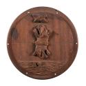 DescriptionPattern for ship's badge showing a carved depiction of a hound, a plane and a submarine, all made of wood. The upper half of the circular image shows a hound with a collar, intently gazing at a war plane right above it. The two wings of the plane are marked with a cross each. The collar serves to connect the two halves of the image, the lower one of which contains the mirror image of the same hound. This hound looks down onto the surface of the sea where there is an emerging submarine.Six small holes around the outer circle as well as further holes seem to have served to mount the badge when in use. Although this badge could not be identified as to which ship it belongs, it may have been a pattern idea design for H.M.S Bulldog.InscriptionsOn verso, top, in black ink "Reg. 1126 MM/1064 20145-6".MaterialWood