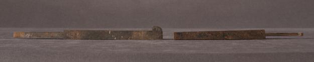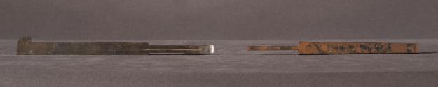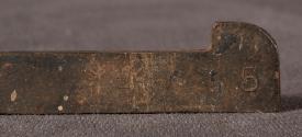 DescriptionTwo rebate plane irons of varying sizes and shapes. The larger is marked '5' and features a long notch. The smaller also sports a notch on its narrower blade, but is unmarked.InscriptionsOn recto, the larger plane iron is marked '5'.Annotations and MarksThe larger plane iron is marked '5'.Material