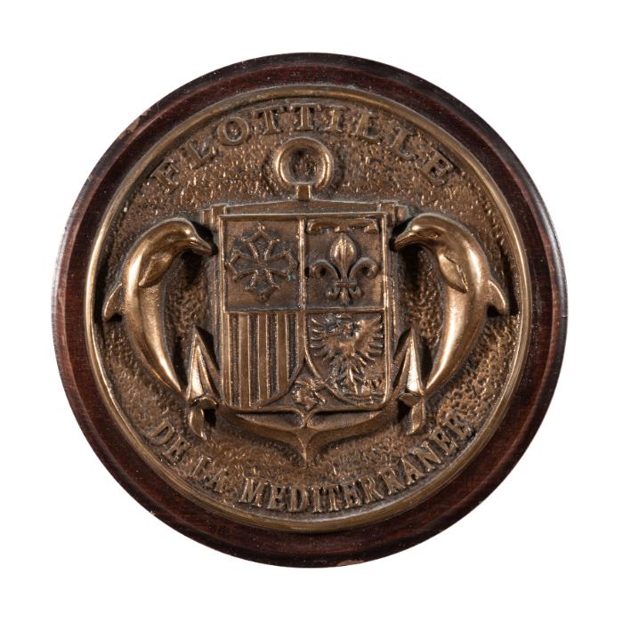 DescriptionA round bronze badge mounted on a circular wooden plaque. The coat-of-arms in the central part is quartered - the top-left quarter depicts a cross, the top-right quarter depicts a fleur de lys with crenallations, the bottom-left quarter bears a pallets field, and the bottom-right quarter depicts a displayed crowned eagel, the latter being a symbol of power and nobility.There are two supporting dolphins on either side. The coat-of-arms is superimposed on an anchor. The item is not polychromised.InscriptionsOn recto "FLOTILLE DE LA MEDITERRANEE". In black ink under sticker "Reg. No. 1296".Annotations and MarksOn verso sticker in central part "FiA Graveur-Editeur 69571 Dardilly (France) Tel. 0472172080 - Fax 0478432771". Carved inside the wood above sticker "FIA LYON".MaterialWood, bronze