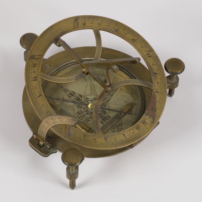 DescriptionA fine 18th century portable equinoctial sundial, with engraved hour dial supported on a brass stand with three adjustable feet allowing it be at level when in use, indicated by the bubble device enclosed withing the compass rose. Various makers of similar sundials have been noted in the 18th century, namely Johann Norbert Holderich (1749-1806) of Augsburg, Dudley Adams (active 1788-1817) or Peter Dollond (1731-1820). Considering that the compass cardinal points are in English, the maker could possibly be British.InscriptionsThe compass cardinal points, and other numerical forms related to its function.MaterialBrass