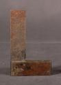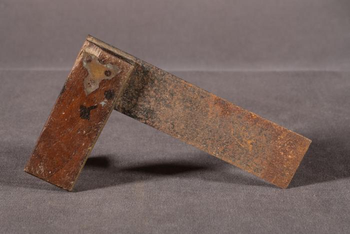 DescriptionL-shaped square with metal rule, riveted thrice in a wooden frame, reinforced by a brass plate.MaterialWood; Iron; Brass