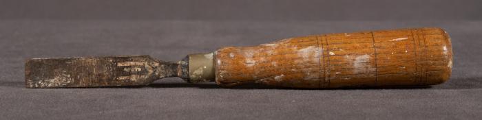 DescriptionA turning chisel composed of a wooden handle; a brass ferrule in good condition; and a chisel blade with a tapered-face frontal edge, parallel side edges and an indistinct trade mark. The rear of the blade is narrower and features a curved taper almost all the way to the ferrule.InscriptionsInscribed with indistinct trademark.Material
