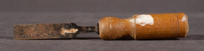 DescriptionA turning chisel composed of a wooden handle, and a wide wood-turning blade with a tapered-face frontal edge, parallel side edges and an indistinct trade mark on both sides of the blade. The rear of the blade is narrower and features a curved taper almost all the way to the handle and tang.InscriptionsInscribed with indistinct trademark.MaterialWood; brass; steel