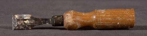 DescriptionA turning chisel composed of a wooden handle with a sawn-off pommel; a brass ferrule, unpolished; and a paint-smeared turning chisel blade with a multi-faceted upper face, flat lower face, thin edge and a trapezoidal crossection, fairly oxidised. Blade is also inscribed with the John Bull trademark and what appears to be Hearnshaw Bros. Sheffield. The blade tapers slightly at the back all the way to the dome at the ferrule.InscriptionsInscribed "Hearnshaw Bros. Sheffield".Annotations and MarksJohn Bull trademark.MaterialWood; steel; brass