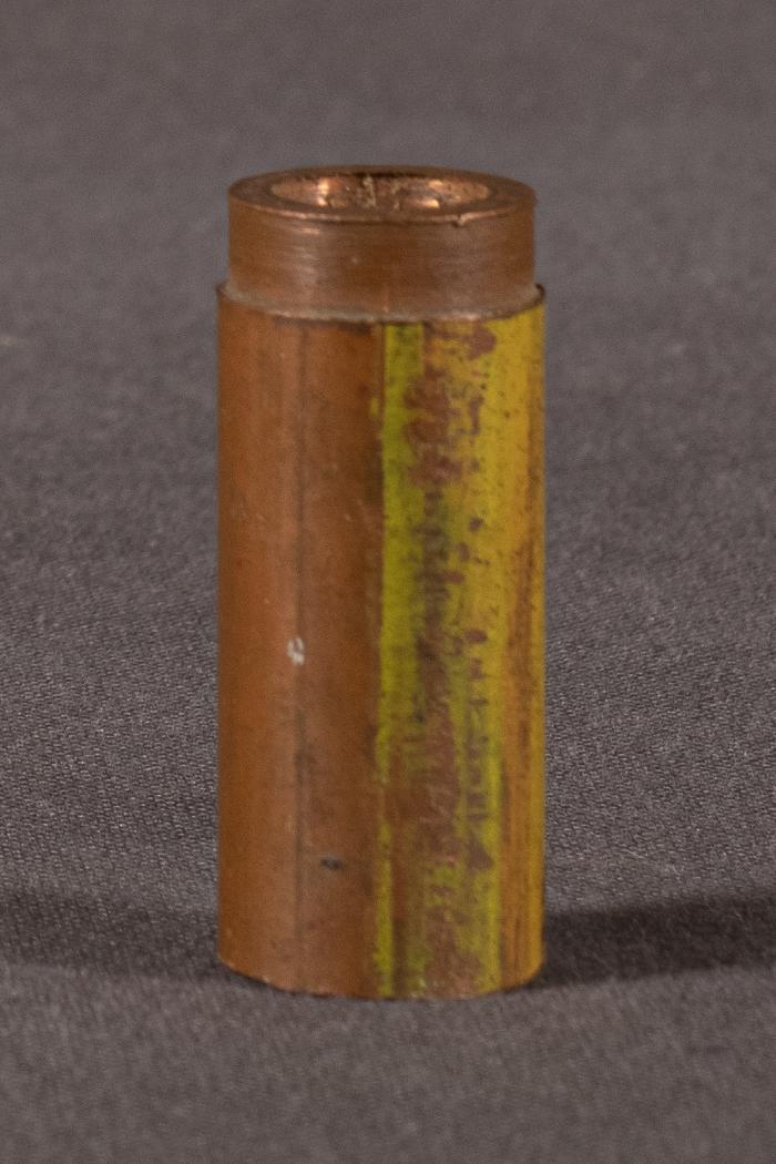 DescriptionA cylindrical piece of copper that appears to have been sawn off on one side and drilled with some sort of turning apparatus on the other. The surface appears to have been somewhat spray painted yellow.MaterialCopper