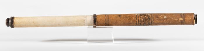 DescriptionMid 18th century card bodied refracting Telescope covered with parchment decorated with flowers; eye-piece missing.MaterialPaper, parchment, metal, turtle