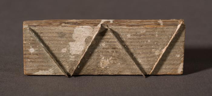 DescriptionScraping blades mounted on a rectangular piece of wood used for scraping stone.MaterialWood, iron